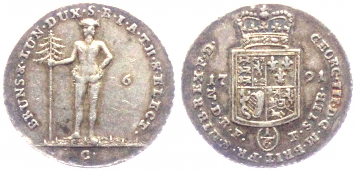 Braunschweig-Calenberg-Hannover - 1791 C - Georg III. (1760-1814) - Wilder Mann - 6 Mariengroschen - 1/6 Taler - f.vz