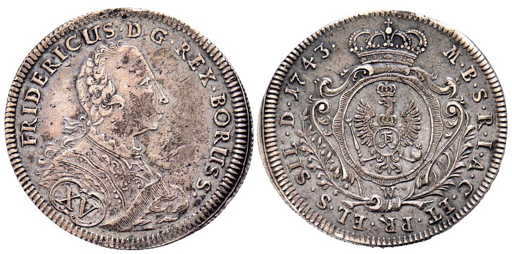 Der Fünfzehnkreuzer von 1743 gehört zu den ersten Münzen, welche die Brelauer Münze unter preußischer Verwaltung geprägt hat. Das Nominal ist bis zur preußischen Übernahme in Schlesien die österreichische Kreuzerwährung.