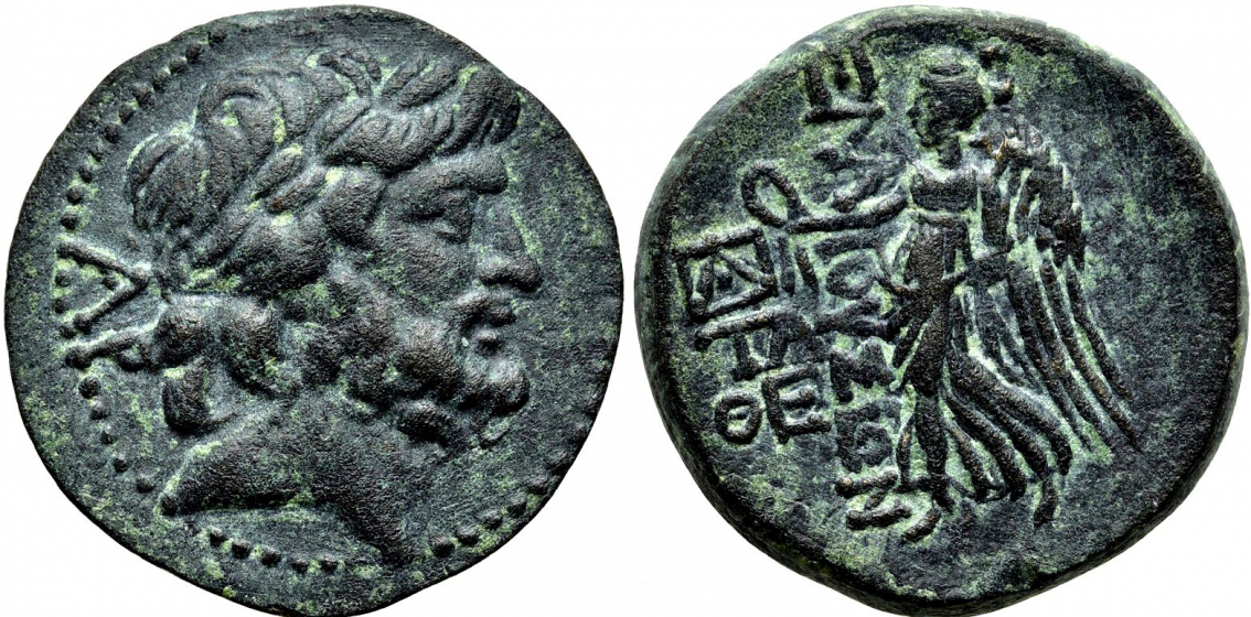 Vs.:Bekrönter Zeusskopf nach rechts, am linken Rand AP.