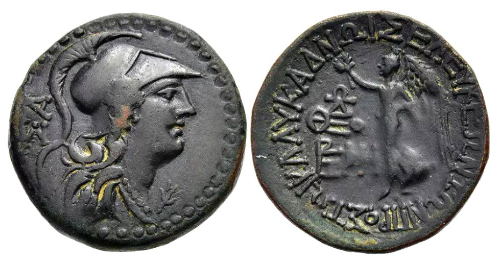 Rs.: Nike mit Kranz nach links stehend, im linken Feld zwei Mpnogramme.