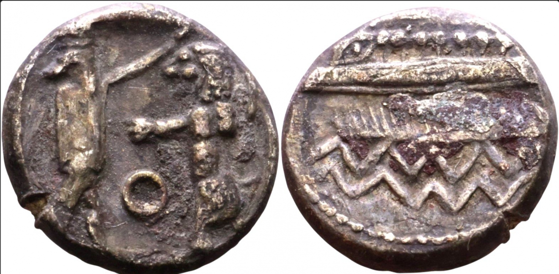 Vs.: Gallere mit ruderten Phöeniziern, unten Wellen.