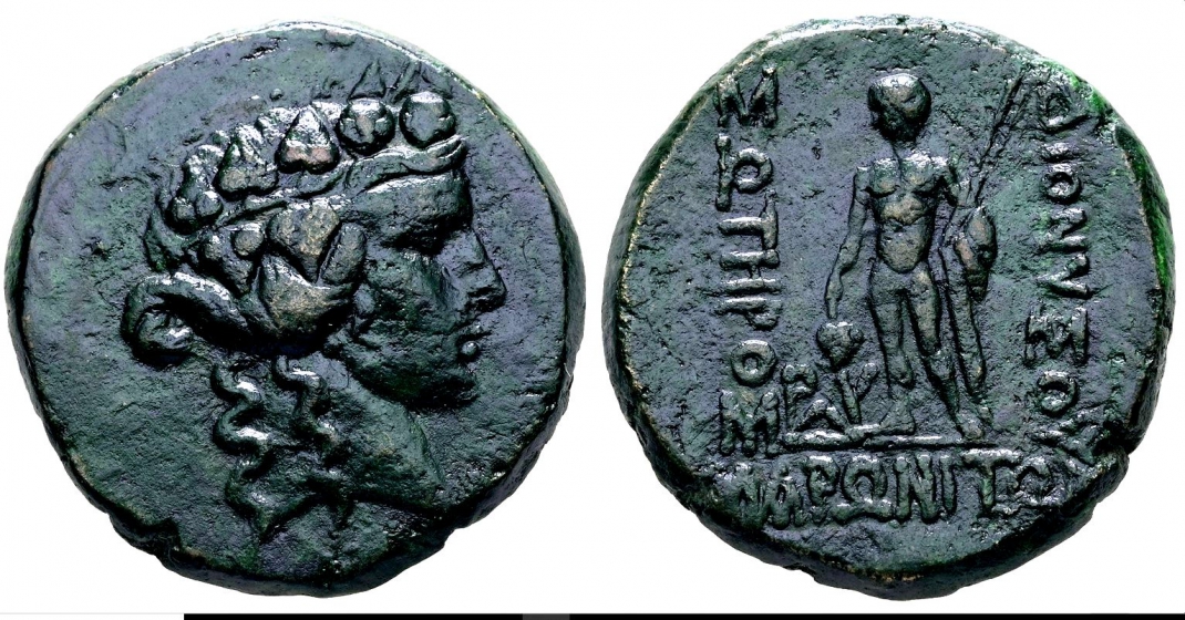Rs.: Nach links stehender Dionysos mit Weintraube und Narthexstiele.