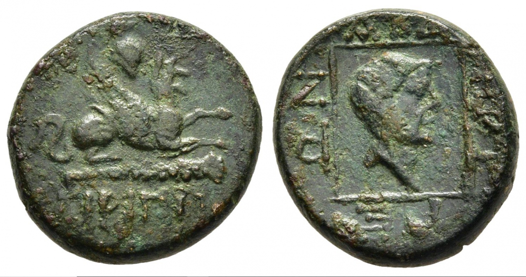 Vs.: Griffin auf Keule sitzen nach rechts, Weintraube oben.
