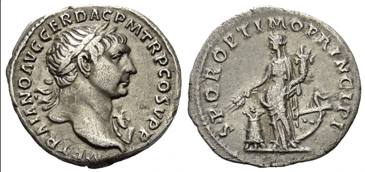 Umschrift: IMP TRAIANO AVG GER DAC P M TR P COS V P P.