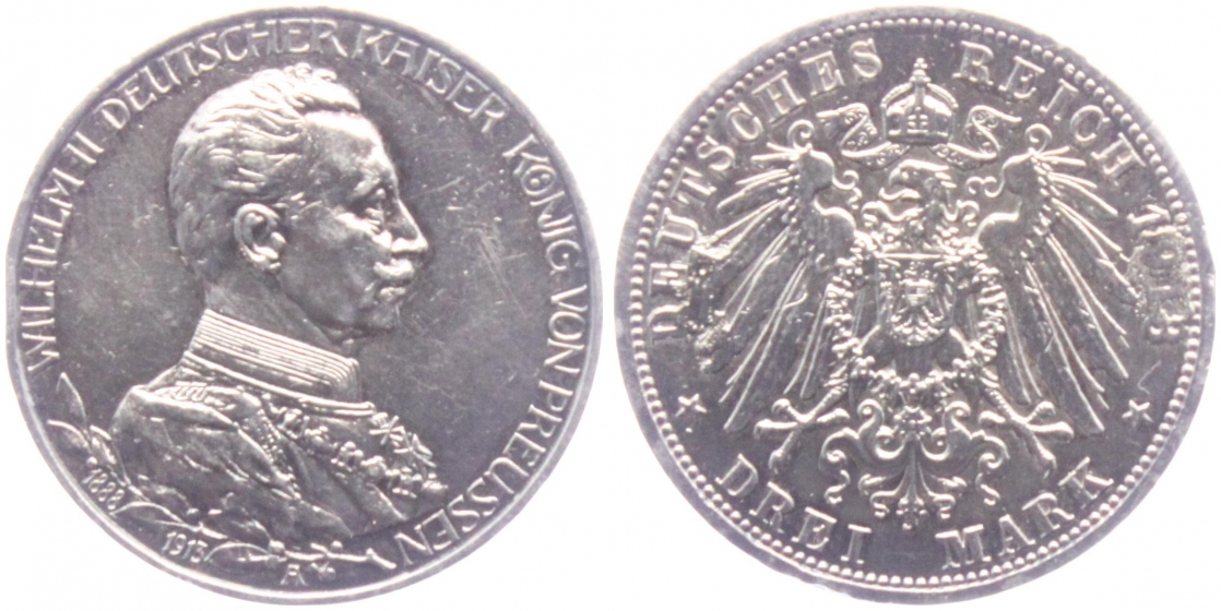 Preussen - J 112 - 1913 A - Wilhelm II. (1888-1918) - in Uniform mit Regierungsdaten - 3 Mark - ss RF